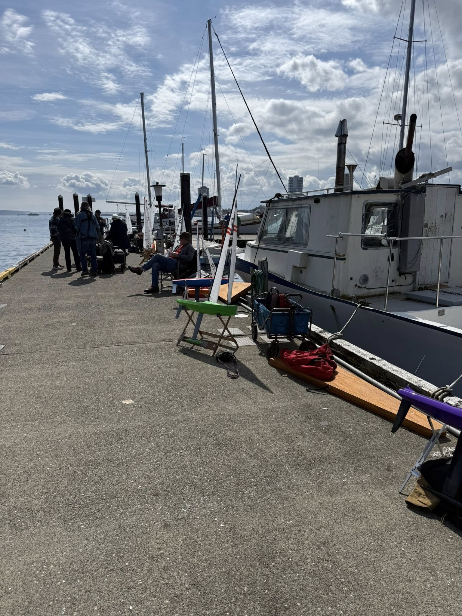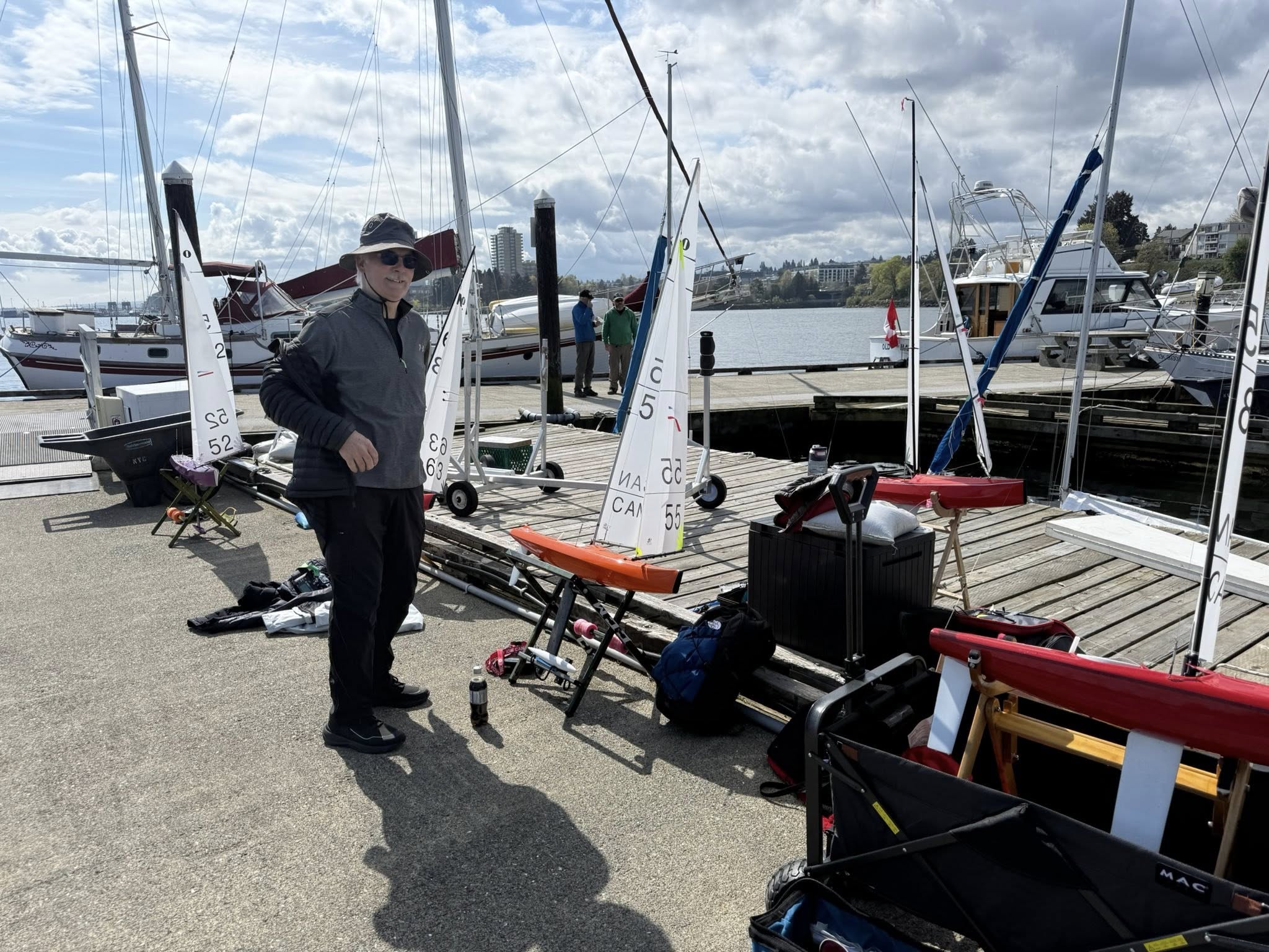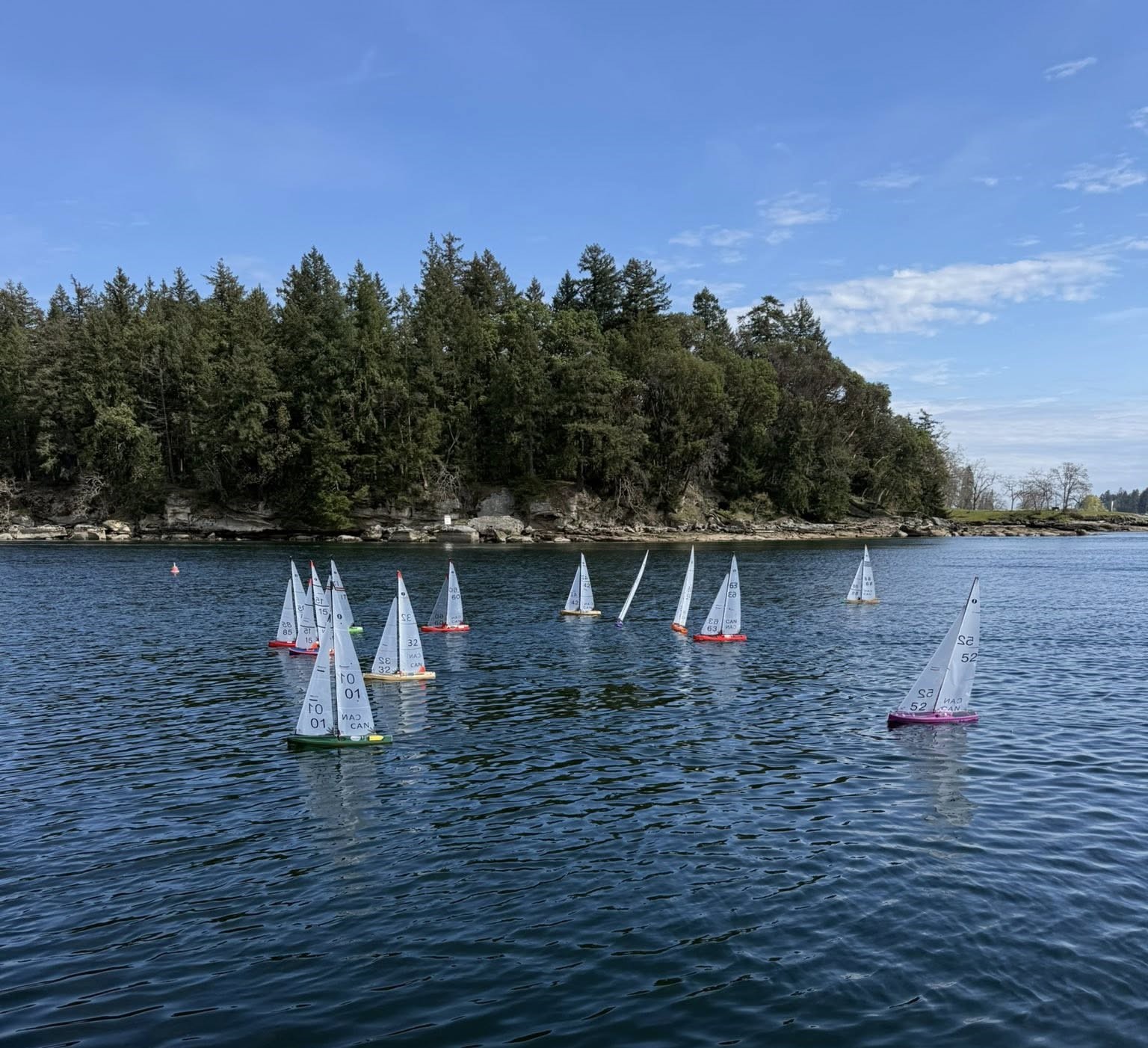 Thirteen keen IOM sailors gathered on the outer dock of Nanaimo Yacht Club to enjoy a day of racing.   The rain gods stayed away, the sun shone intermittently and the wind gods preferred to keep us guessing.   Oh, and I forgot to mention the 1/2 knot current that made everything more interesting.  All this created a race track filled with opportunities.    Those that kept their heads up were rewarded handsomely!.